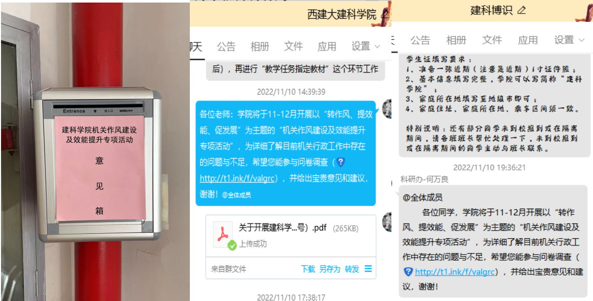 前期,为高效推进此次专项活动开展,学院成立了由党委书记、院长担任组长的机关作风建设及效能提升专项活动领导小组,并通过设立意见征集箱、开展线上问卷调研、召开座谈会等多种方式和渠道开展调研,广泛听取意见,了解师生需求,为有效开展专项活动奠定了良好基础。