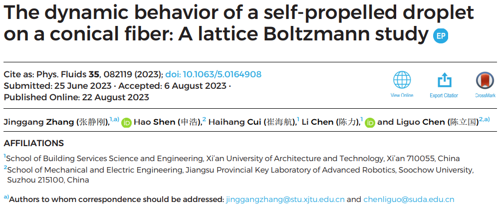 热工流力教学研究中心青年教师张静刚在流体物理领域研究取得重要进展。研究成果以“The dynamic behavior of a self-propelled droplet on a conical fiber: A lattice Boltzmann study”(液滴在锥形表面的自驱运动研究)为题在流体物理领域权威期刊《Physics of Fluids》(期刊中文名:流体物理学,2022年影响因子为4.6)上在线发表。论文因其新颖性和创新性被主编选为Editor’s Pick论文。论文的第一作者为桃子视频