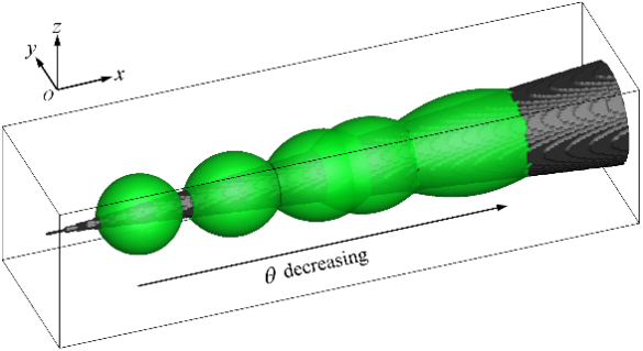 为探索液滴在锥形表面自发输运机理,本文首先将格子玻尔兹曼颜色模型拓展到变密度比系统,并通过“预估-矫正”方法实施接触角,发展了适用于复杂几何结构的非等密度比两相流动模型。随后,基于该模型并从移动接触线的角度合理地解释了液滴在锥形表面自发输运机理,即表观前进和后退接触角分别大于和小于施加的接触角,为使表观前进和后退接触角与施加的接触角相等,前进和后退接触线均会向基底运动(见图2)。
