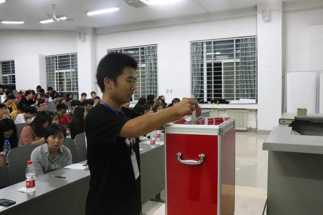 李芸博老师作为主监票员与记票员左弼楠、唱票员袁文浓共同进行无记名投票。
