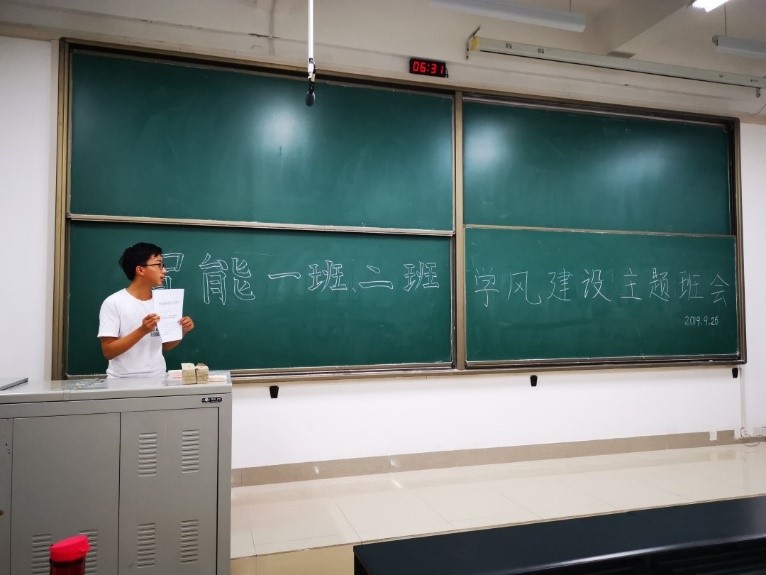 本次学风建设主题班会主要通过讲解学生手册,向同学介绍了学校管理制度、违纪处罚规定等重要内容。首先,18、19级各班学习委员针对大学生学习时应该注意的事项进行了简明扼要的发言,指出了同学们以后学习的方向、学习中应该避免减少的错误以及应注意的规章制度。同学们认真听讲,对学校的各项规章制度有了更深入的了解。