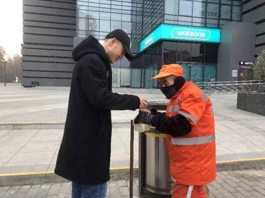 环卫工人伴着月色已经开始了辛勤的工作,此时,建环四班部分同学也已分为十个小组,寻找在这座城市忙碌的身影,准备为他们送出热腾腾的爱心早餐,并帮助环卫工人清扫路面。在交谈过程中,同学们了解到在寂静的大街上还未有行人的身影时,环卫工人早已拿着簸箕奔走在城市的大街小巷。早餐对他们而言,也仿佛只是一顿加餐,当温暖的早餐被递到他们手上时,同学们看到他们皲裂的手紧紧握着早饭,也正是他们纯朴的笑温暖着我们,更温暖着城市里所有的人。他们桔红色的工作服在路灯的辉映下,闪烁出点点的光芒。