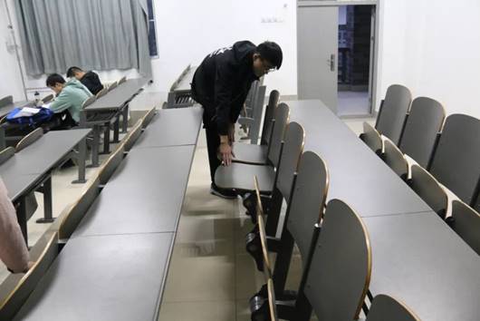 活动伊始,青年志愿者服务队全体成员分为四组,分别对学府城9栋1-4层教室的桌椅进行检查保修工作。在工作的过程中,每个小组都由负责人带领到达指定楼层开始检查,每个人都明确自己的使命,认真负责,逐个排查座椅的损坏情况,不漏掉每一个小细节。各组人员团结协作,互相帮助,一起商量并准确地记下损坏座椅的位置,最后由负责人统计汇总向维修部进行申报,等待维修,从而为同学们改善学习环境。